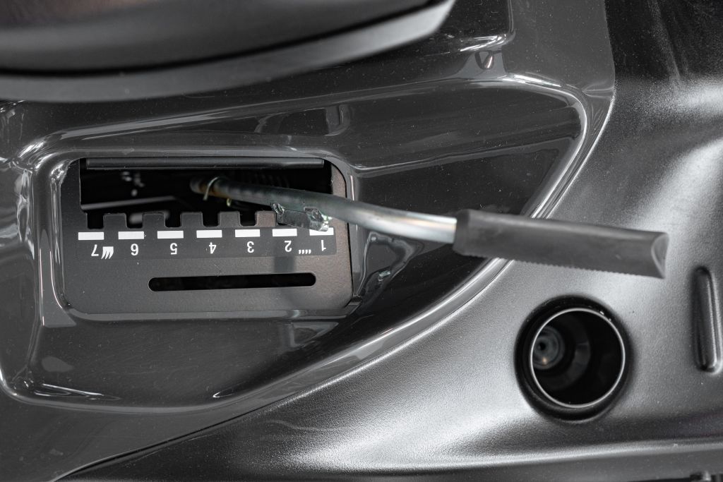 The chains mounted at the front of the mower deck provide protection from stones that could be ejected.